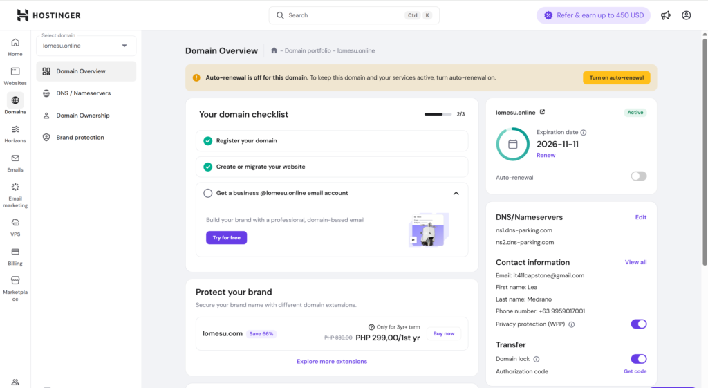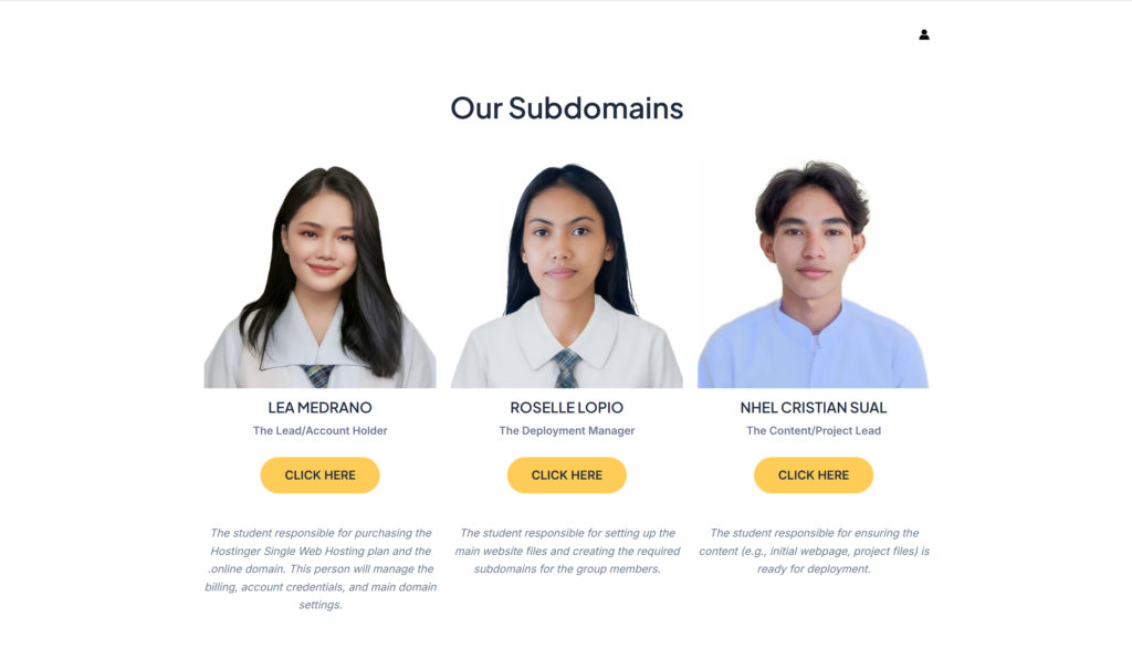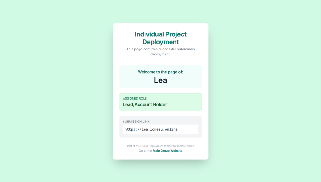 Upon successful purchase of the domain, we set up the main page to display our names, roles, and our subdomains.