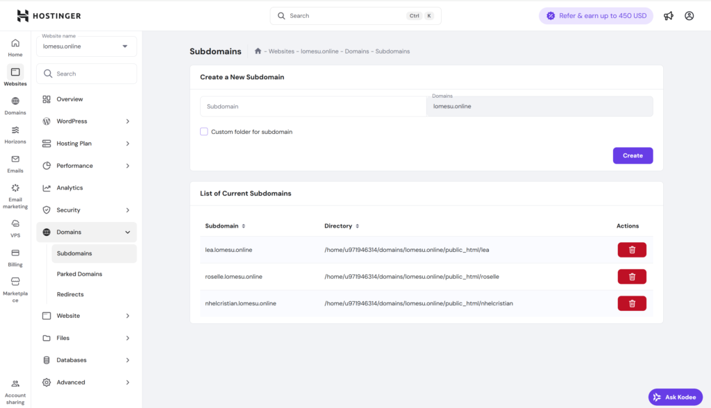 We then added our individual subdomains and uploaded the HTML files to represent the subdomain.