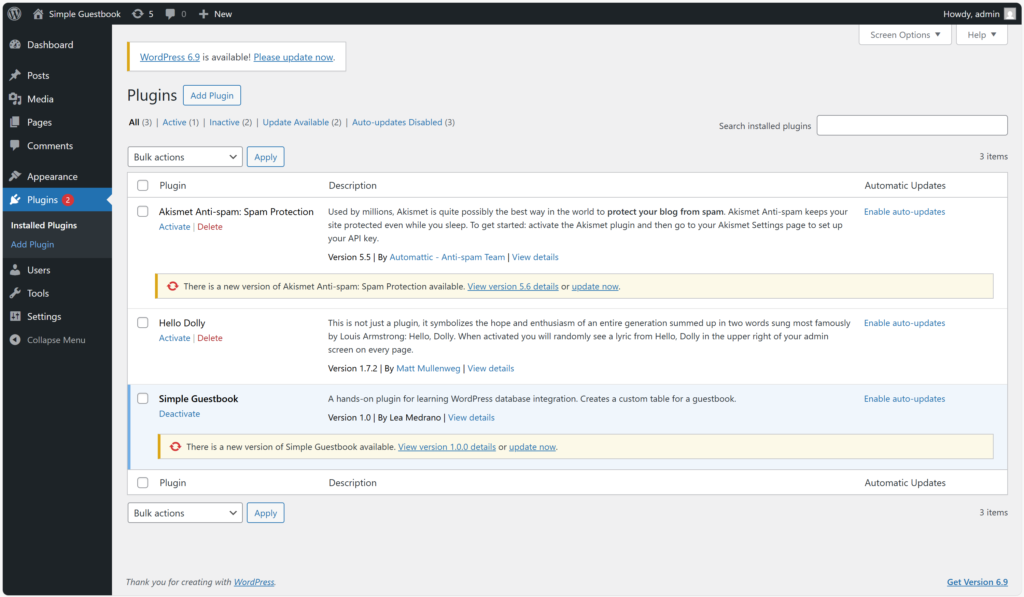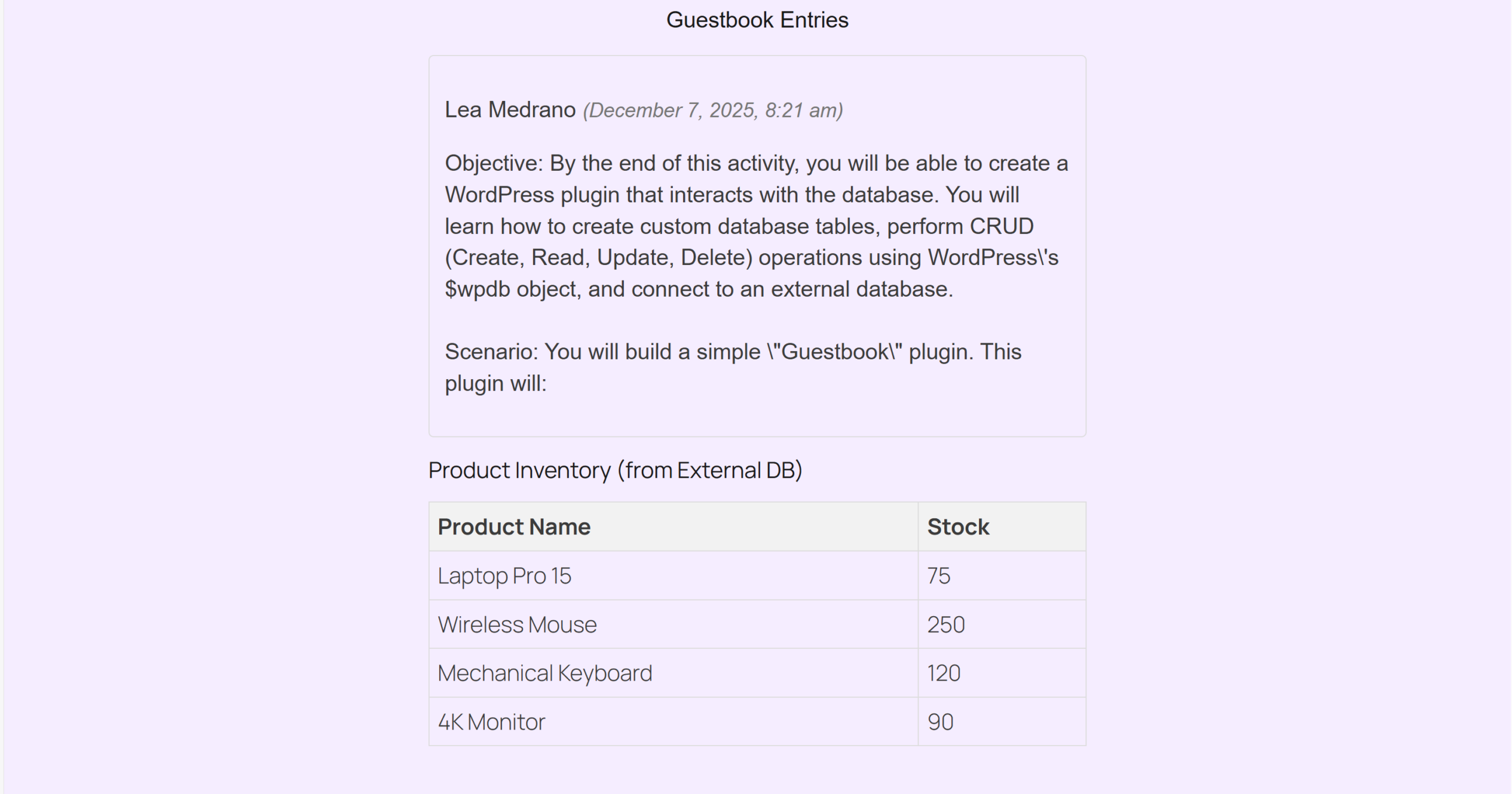 * Description: A hands-on plugin for learning WordPress database integration. Creates a custom table for a guestbook.
